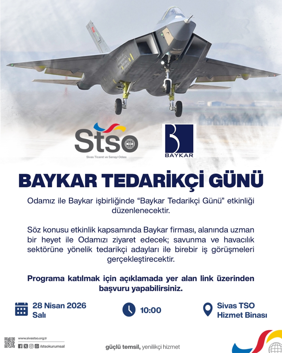 Sivas Ticaret ve Sanayi Odası ile Baykar işbirliğinde, 28 Nisan 2026 Salı günü saat: 10.00’da Odamızda “Baykar Tedarikçi Günü” etkinliği düzenlenecektir.