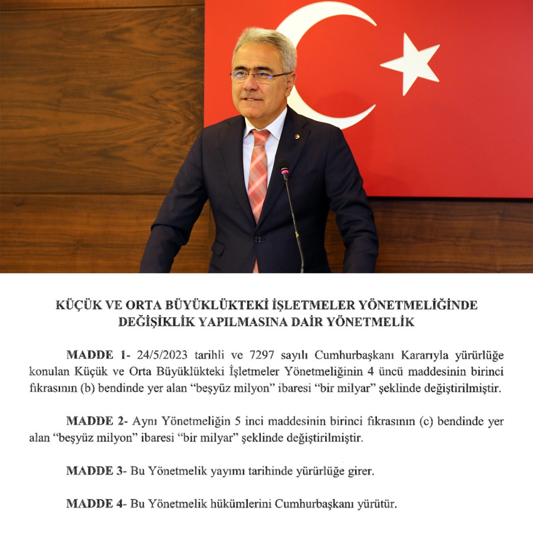 “Uzun süredir iş dünyamızın gündeminde olan ve işletmelerimiz için büyük önem taşıyan KOBİ tanımı güncellenmiştir. Ekonomik büyüme, enflasyon ve döviz kurları gibi etkenler dikkate alındığında, KOBİ tanımının güncellenmesi uzun zamandır beklenen ve gerekli bir adımdı. Bu değişiklikle birlikte çok sayıda işletme, KOBİ statüsüne girecek ve bu kapsamda sunulan desteklerden faydalanabilecektir. Özellikle Organize sanayi bölgeleri (OSB), küçük sanayi siteleri, ticaret merkezleri gibi üretim ve ticaretin yoğun olarak yapıldığı alanlarda faaliyet gösteren firmalar artık bu destek mekanizmalarından daha geniş ölçüde yararlanma imkânına kavuşacaktır."